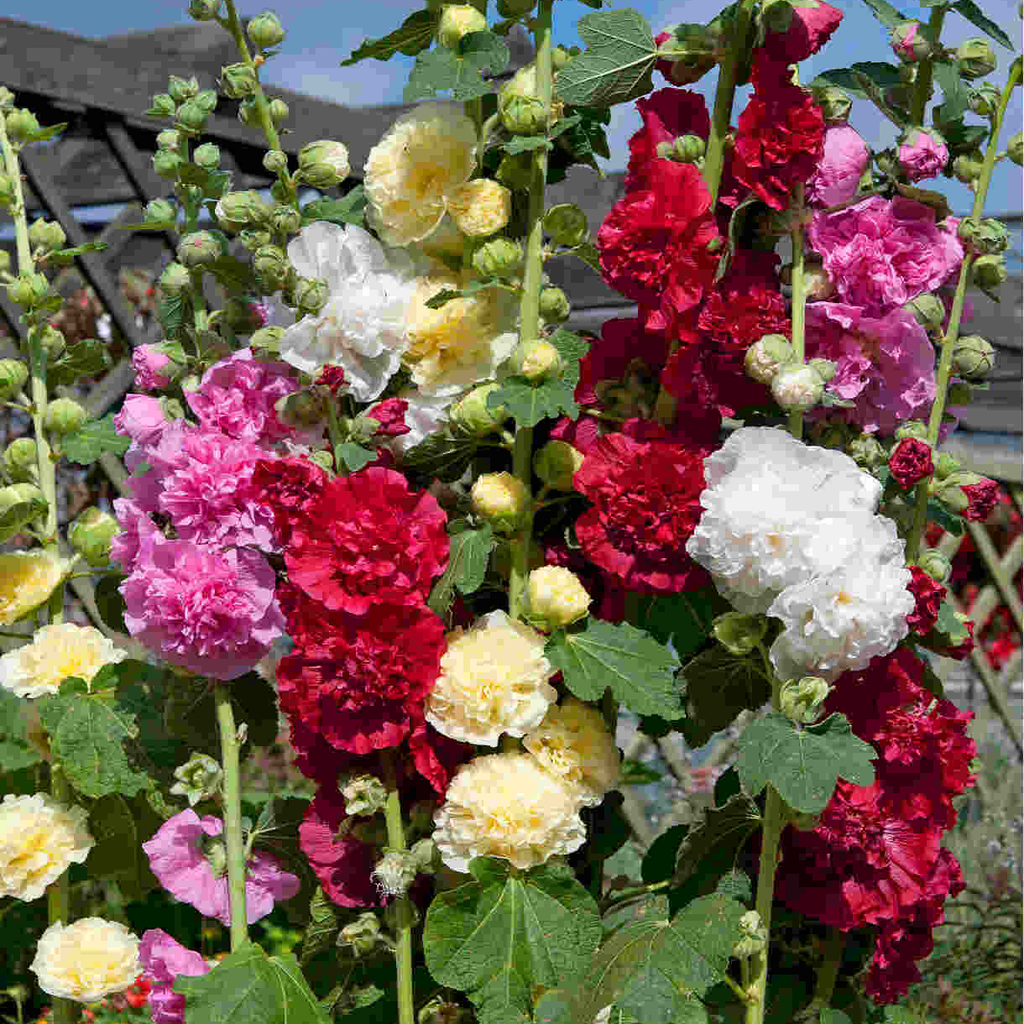 Chater’s Mix Hollyhock – 20–25 seeds | Classic cottage garden favorite with double blooms in mixed colors (rose, salmon, red, buff, yellow, maroon, white, scarlet).